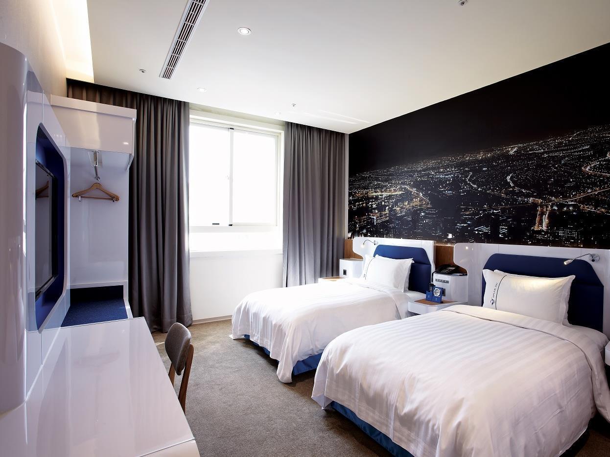 비행기 좌석을 모티브로 한 벽면 디자인은 여행의 설렘을 객실 안까지 이어주더군요.